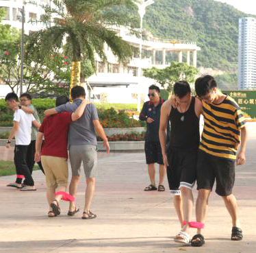 在并肩齐步走中,一不小心就会摔倒,但大家都在努力前行,在游戏中培养成员之间的默契与协作能力。