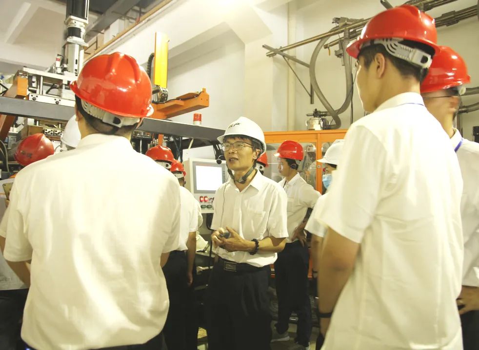 研发技术中心的总工程师白锋,在车间现场给学员介绍新产品——速龙4+4洗洁精专机吹瓶机的特点。速龙机速度快,性能更稳,定位精准,生产周期仅22秒。乐善将不断研发速度更快,更好的吹瓶机。