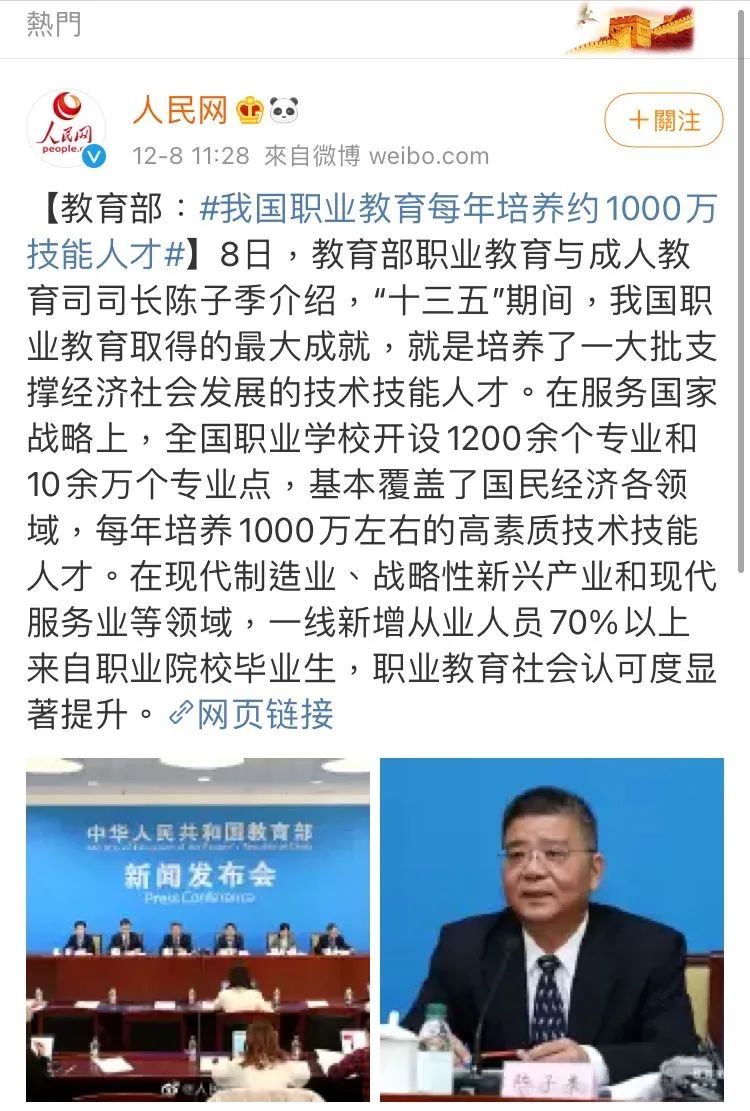 12月8日,一条新闻引发热搜,教育部召开第三场教育2020“收官”系列新闻发布会,介绍“十三五”期间我国职业教育改革发展的情况。