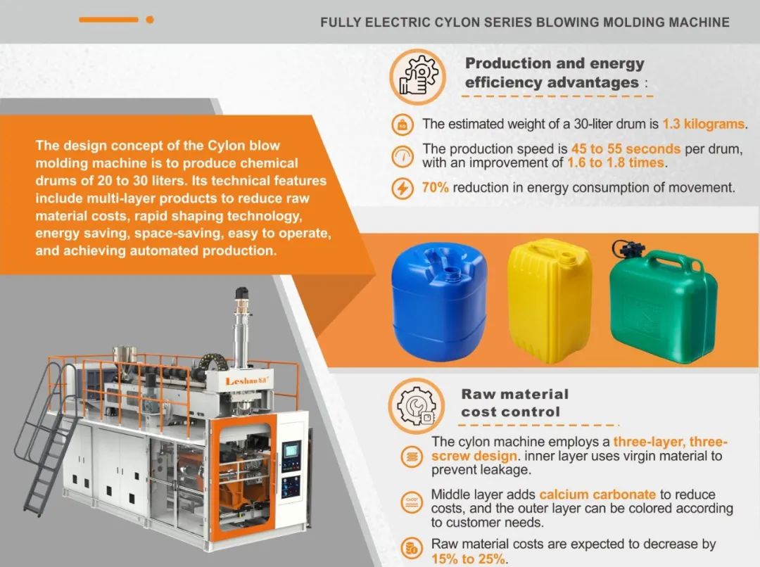 The estimated weight of a 30-liter drum is 1.3 kilograms, with a production speed of 45 to 55 seconds per drum. Compared to the traditional speed of 70 to 80 seconds, Cylon represents an improvement of 1.6 to 1.8 times, with a 70% reduction in energy consumption of movement.