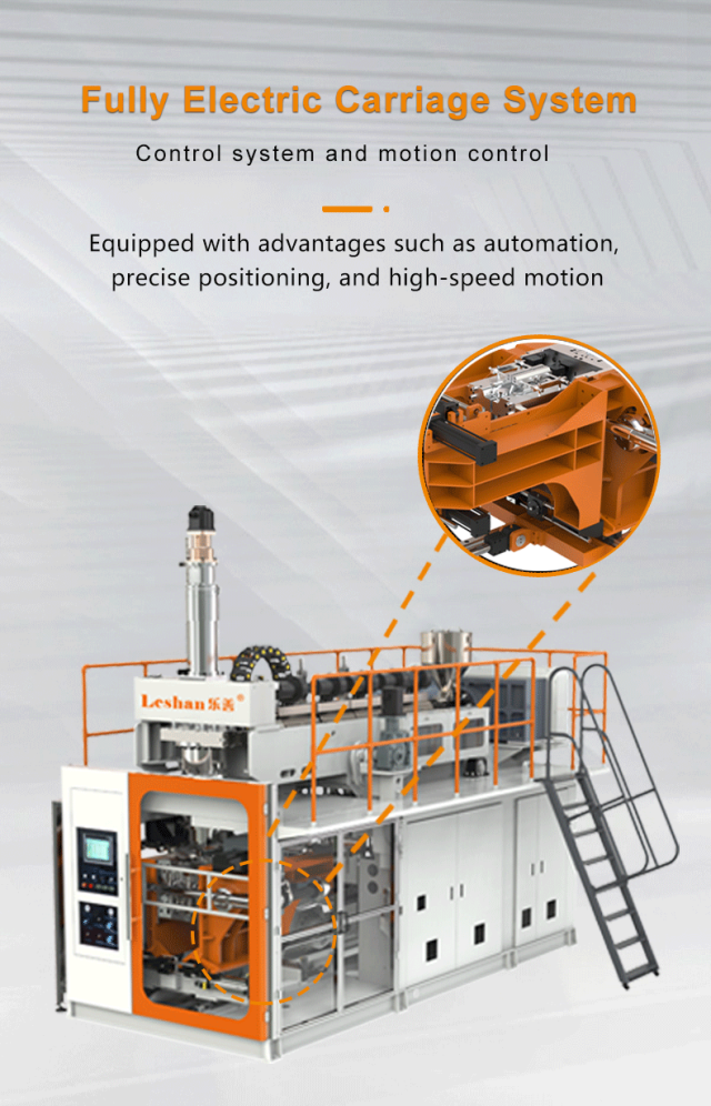 The machine achieves blowing and shaping at the first station, pressure compensation at the second station, and scrap trimming and cooling at the third station.