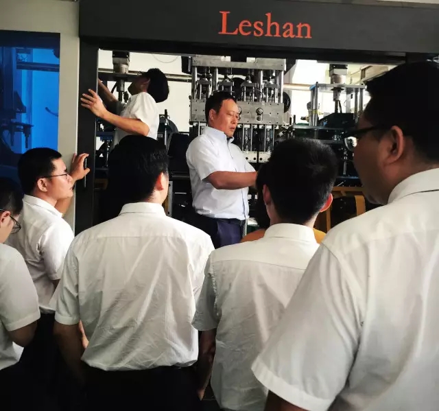 年中会议期间,郭总亲自带领所有业务精英,到展厅洗洁精瓶柔性生产线样机前,进行新技术讲解。