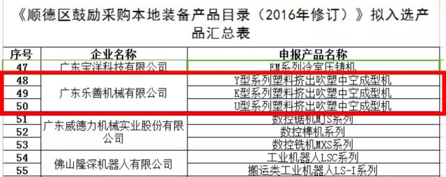 记者从顺德经济网获悉,顺德区鼓励采购本地装备产品目录(2016年修订)开始公示,“乐善塑料挤出吹塑中空成型机”等70个产品入选。按照相关政策,在规定年度内,企业采购目录内的产品,按每项产品销售额的10%进行补贴,最高可达10万元。