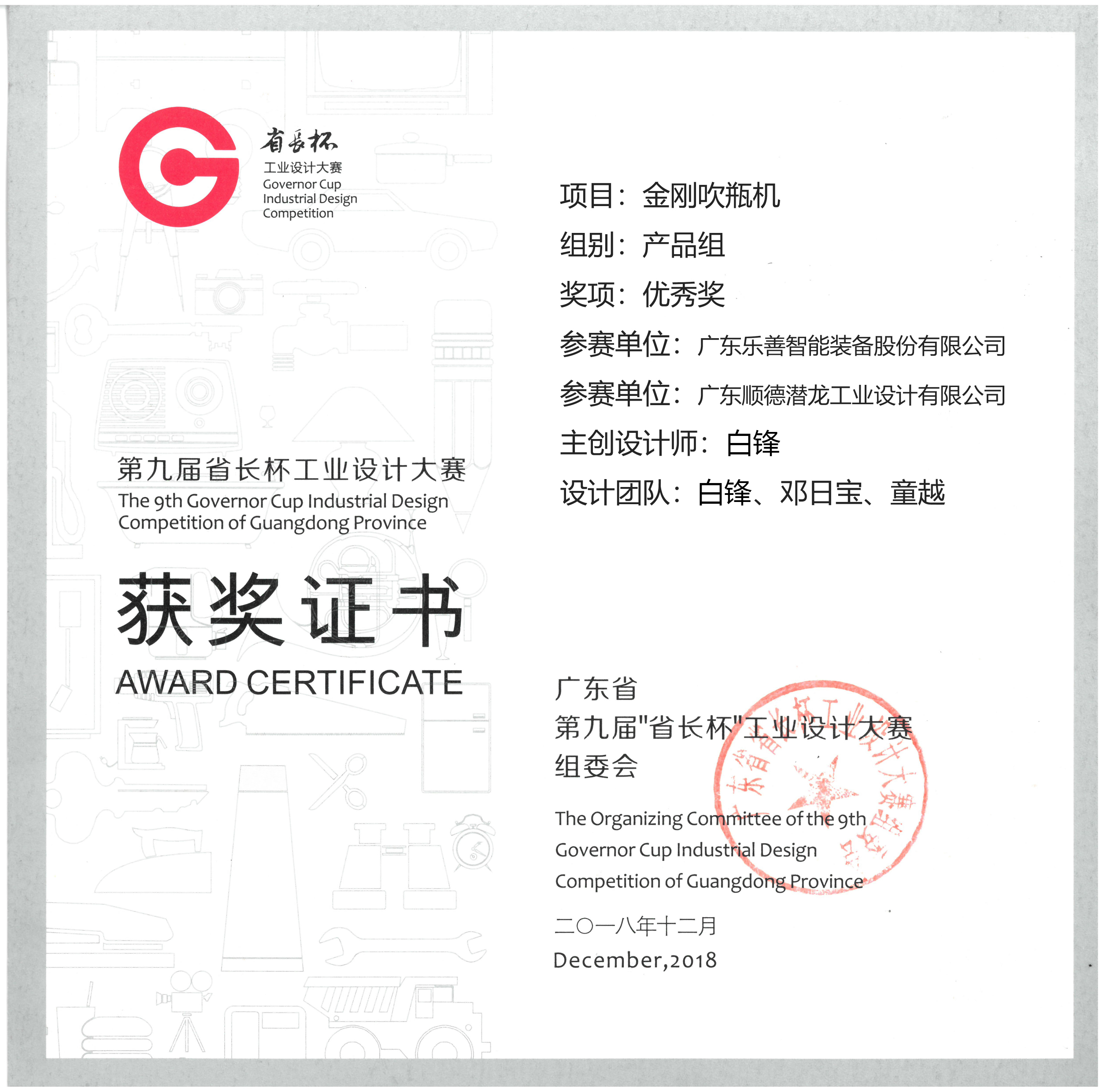 2018年12月,乐善智能团队荣获第九届省长杯工业设计大赛优秀奖。本次大赛乐善参赛项目是与顺德潜龙工业设计有限公司共同合作的金刚吹瓶机,参与设计成员由白锋、邓日宝、童越组成,其中项目主创为白锋先生。乐善智能公司可以获得如此骄人的成绩离不开他们的努力。